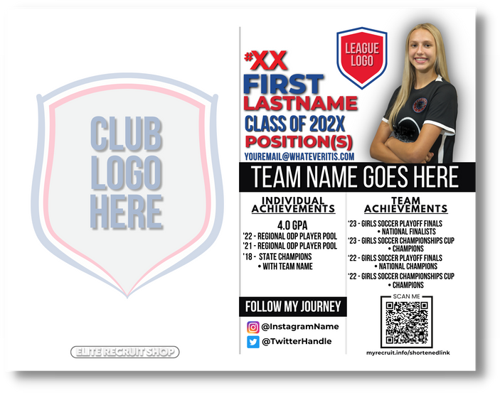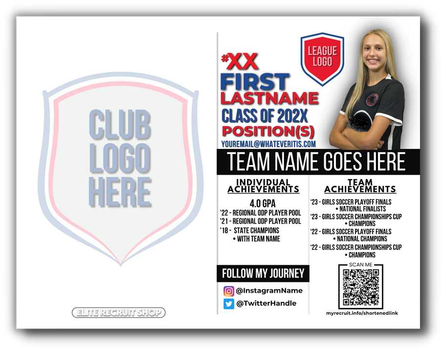 Coaches get hundreds of emails per week. Stand out from the rest by mailing them one of our custom post cards. Hand write a note to coaches letting them know which events they can watch you at, or thank them for a campus visit or id camp invite while also sharing your player info and a link to your recruiting site or game film in an easily scanned QR code.